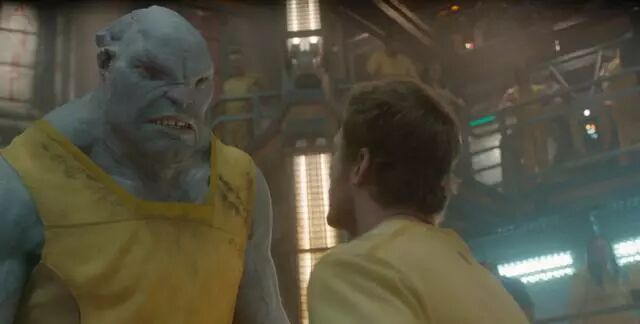四人走进Kyln监狱之后,一位蓝色皮肤的壮汉犯人拦住Peter去路。叽里呱啦一番之后惨遭Groot蹂躏。他对Peter说那两句话其实非常三俗的。亮点在最后一句: