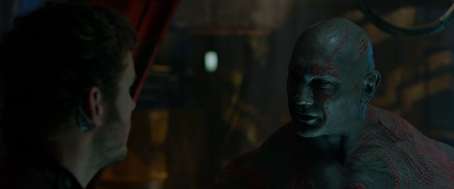 越狱的紧要关头Drax又跩大词,于是宝强吐槽,你丫是个活字典啊。Drax立刻冬兵附体,谁是字典?你才是字典。此时干脆面立刻解围:他们脑筋不转弯,打比方他听不懂。“Metaphors are gonna go over his head. ”Drax立刻反驳: “Nothing goes over my head. My reflexes are too fast, I would catch it.”