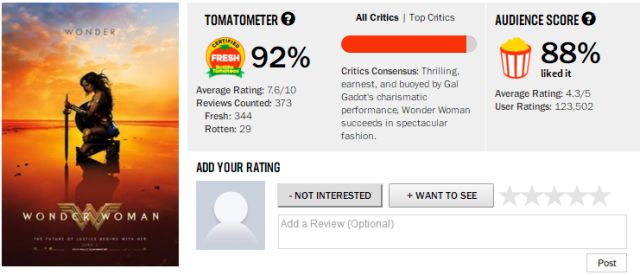 《神奇女侠》烂番茄评分92%
