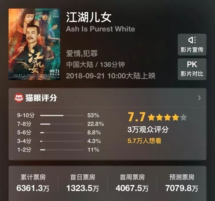 将视角拉高,联系过往,从点映取消、电影删减到土味营销、影评口水战,《江湖儿女》接二连三引起的舆论关注让一部分公众陷入了阴谋论,认为这些有意无意的事件最终目的是作用于《江湖儿女》的电影票房。但现实是《江湖儿女》上映8天,累计票房6361万,排片占比下滑至9.1%,综合票房占比远远落后于同期上映的《悲伤逆流成河》、《黄金兄弟》。