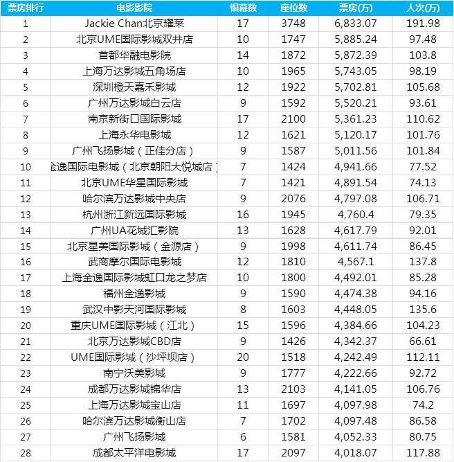 【6】影院:2014年前三季度TOP100影院票房累计约36.9亿元,票房占比16.8%。票房破4000万以上影院28家。