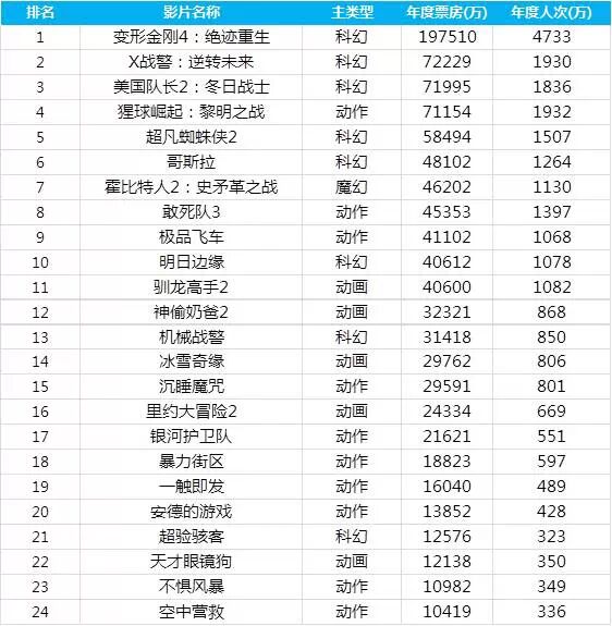 据统计,2014年第三季度票房为82.16亿元,加之2014年上半年全国票房137.43亿元,2014年前三季度票房累计已达219.59亿元,顺利超2013年全年票房。其中,过亿影片共52部,《变形金刚4:绝迹重生》以19.7亿元拿下内地单片票房冠军。