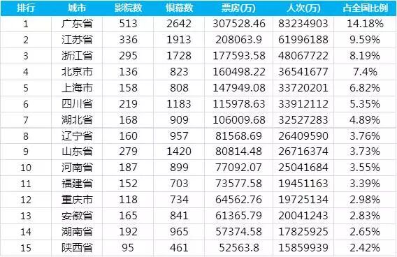 【3】省份:2014年前三季度TOP15省份票房累计约177.25亿元,票房占比80.71%。广东省占比14.18%;江苏省占比9.59%;浙江省占比8.19%。