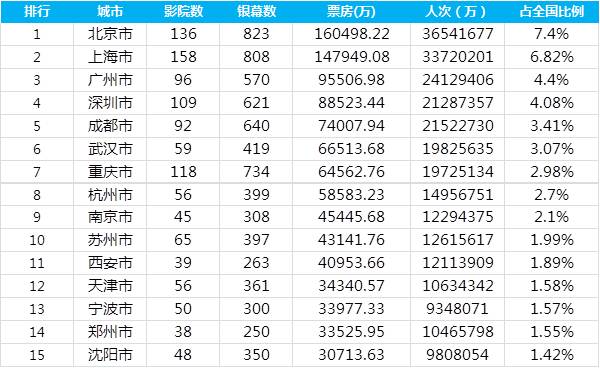 【4】城市:2014年前三季度TOP15城市票房累计约101.82亿元,票房占比46.3%。北京、上海两城市累计票房破10亿元,北京市占比7.4%;上海市占比6.82%;广州市占比4.4%。
