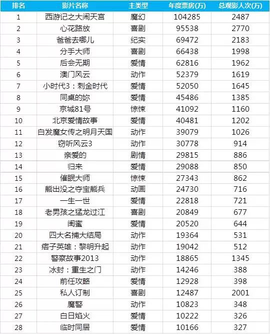 【1】国产影片:2014年前三季度,过亿元国产影片28部,累计票房100.32亿元。其中TOP15国产影片票房累计约78.6亿元,占比35.8%。《西游记之大闹天宫》破10亿元;《心花路放》奋追10亿元(上映中),过5亿元影片达7部。
