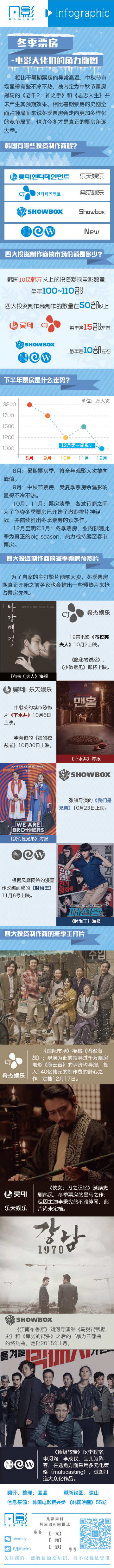 韩国四大电影制作公司希杰娱乐(CJ娱乐)、Showbox影业、NEW影业、乐天娱乐每年出品电影的份额约占据整个电影市场的90%,在韩国,制作费用10亿韩元(约为560万人民币)以上的电影,年发行量在100—110部左右,这其中有70部以上的电影是由上述四大制作公司发行的,本期主文将详解几家公司在电影投资制作时的题材倾向以及发展定位,看看韩国电影大佬间如何相互角力。本期图文后附的图片将带你提前预热韩国四大电影发行商之间的冬季票房势力版图。