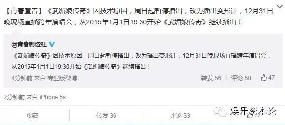 (青春剧透社是“湖南卫视电视剧”的官方微博,今晚20:10左右发微博称《武媚娘创奇》将暂停播出)