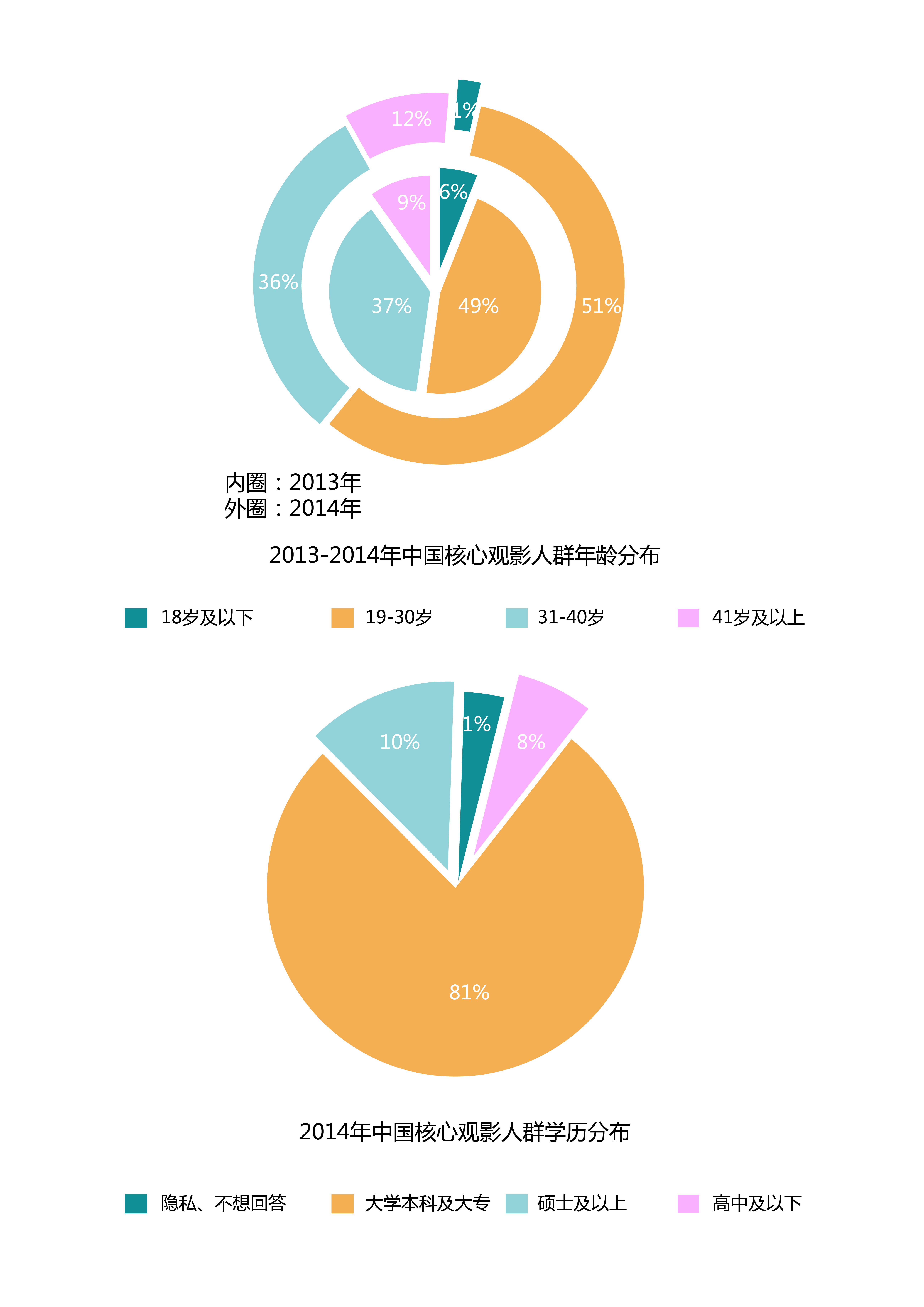 根据今年1月6日艺恩发布的《2014年中国电影市场影响力研究报告》可以看出,我们的电影观众的主力军依旧是19~30岁人群,较去年比例变化不大,而31~40岁也占据了相当的比例。中国电影观众知识文化程度上来看,大学本科及大专占据了绝大多部分的比例:一切数据表示中国电影文化消费正在由年轻高知白领所引领着。