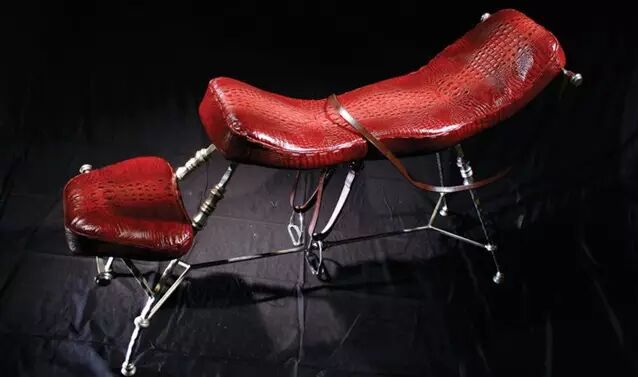 房间铺的真皮地板即使鞋钉踩踏也不会损坏。通过 iPad触摸控制,一张蜂窝状的黄铜网会从天花板上落下。(克里斯汀将安娜锁在它上面。)而这一切都价格不菲。这里的家具均为手工雕刻:英国设计师马克·布雷泽-琼斯(Mark Brazier-Jones)设计的各式座椅(1.46万美元)、拘押箱(2万美元)、液压椅(1.08万 美元)。它们都用于施虐和受虐,但也很吸引人,这些是维斯克夫妇建造房间时的核心物件。由布雷泽-琼斯的公司从英国运过来,加些钱可根据客户喜好定制不同的成品,如加装巧克力棕色皮革、绿绒、用青铜替代铝。