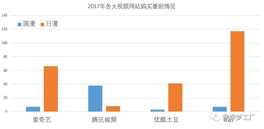 根据数娱梦工厂的统计,相比起去年,今年优酷在购买番剧上略显保守,去年优酷一共购买了92部日本番剧,而今年这个数量降到了41部。爱奇艺在2017年共购买了66部日漫,占新番采购总量的90%。B站延续了去年的风格,2017年共购买了117部日漫,占新番采购总量的94%,其中独播剧有55部。