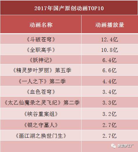 根据统计,2017年开播的国漫全网点击量排名中,TOP10的作品分别为《斗破苍穹》(12.4亿)、《全职高手》(10.8亿)、《妖神记》(6.4亿)、《精灵梦叶罗丽》第五季(6.6亿)、《一人之下》第二季(4.4亿)、《血色苍穹》(3.4亿)、《太乙仙魔录之灵飞纪》第二季(3.3亿)、《峡谷重案组》(3.2亿)、《银之守墓人》(2.7亿)和《画江湖之换世门生》(2.7亿)。