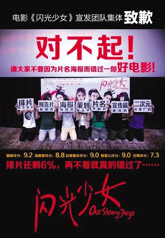 7月24日,此前一直主打二次元的《闪光少女》突然发布了一张下跪海报,意指审美被诟病的宣传策略、预告片、海报,误导了观众对这部高口碑电影的认知。基层员工主动背锅道歉,未免让人心生不适。