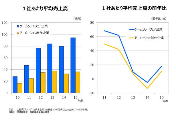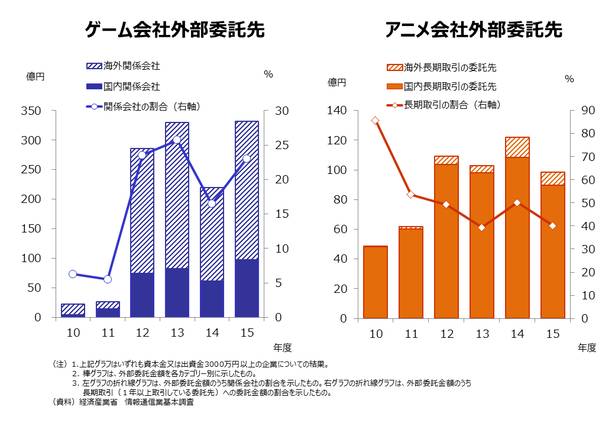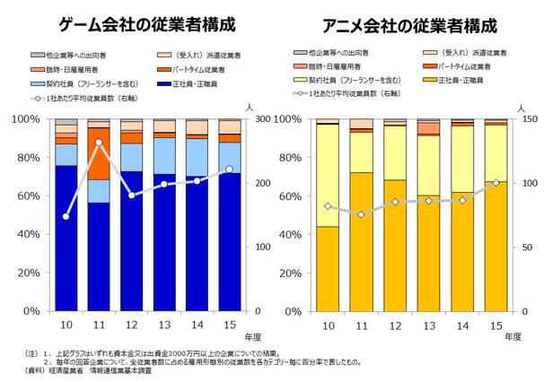 根据信息通讯业的基本调查等的数据,日本两大内容产业——游戏制作公司和动画制作企业在市场规模、企业规模、雇用形式、外部委托还有权利保有的状况等方面都表现出明显的差异。