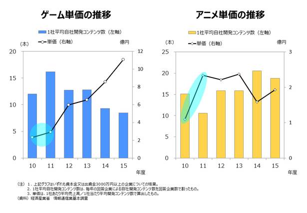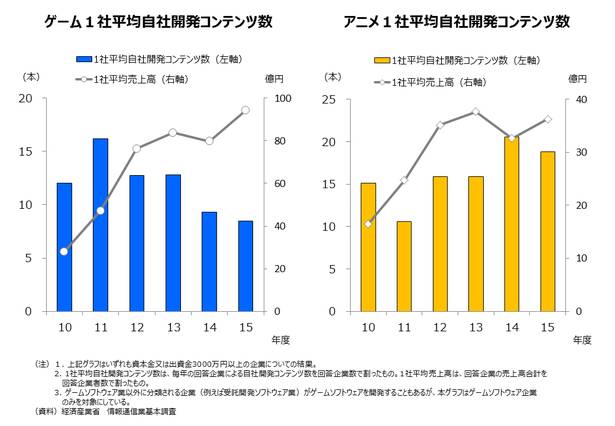 注:两张图表为游戏与动画公司的平均自开发内容数,棒状图为开发数量,折线图为平均销售额。