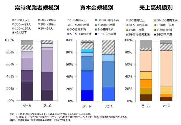 注:不同规模的游戏公司和动画公司的分布比例可见上图。图表从左到右分为常时员工数、资本金和销售额。