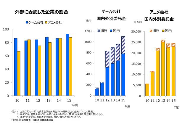 游戏和动画公司都广泛采用外部委托,且委托数逐年平稳上升,但是动画公司2011年委托率尤其高,信息通讯业基本调查的其他数据显示,该年度动画作品单价上升且行业内正式员工雇用比例也显著升高,可见在当时的动画公司制作体制中,作品单价上升的同时,合同工开始转变为正式员工,外部委托数量增加。