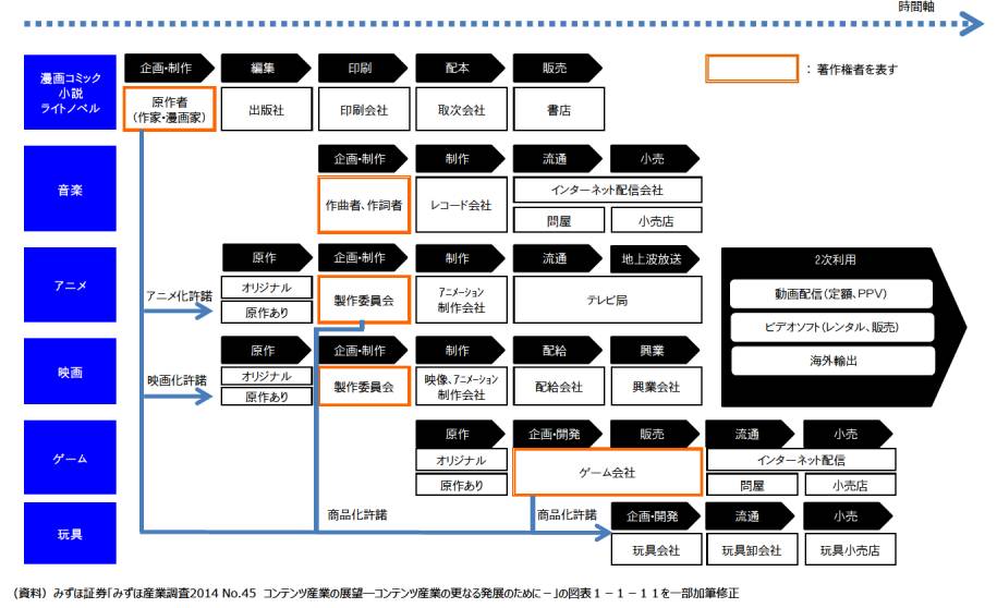 注:以上红色方框表示著作权所有者。漫画与小说著作权为原作者;音乐则属于作曲者与作词者;动画与电影的著作权属于制作委员会;游戏则属于游戏公司,玩具视内容形式而定。