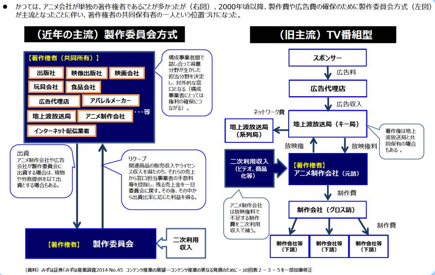制作委员会为著作权所有者,由著作权共有者(出版社、录像出版社、电影公司、玩具公司、食品公司、广告代理商、服装制造商、无线电视放送局、动画制作公司、网络配信业等)共同出资给制作委员会,而委员会将收益按出资比例返还给上述共同出资者。