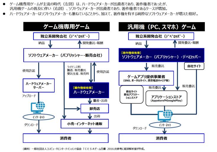 左图为游戏机专用游戏的主流形式,其著作权持有者为硬件制作公司。而右图为PC端、智能手机游戏的产业条线,著作权所有者为软件开发者与发行者。