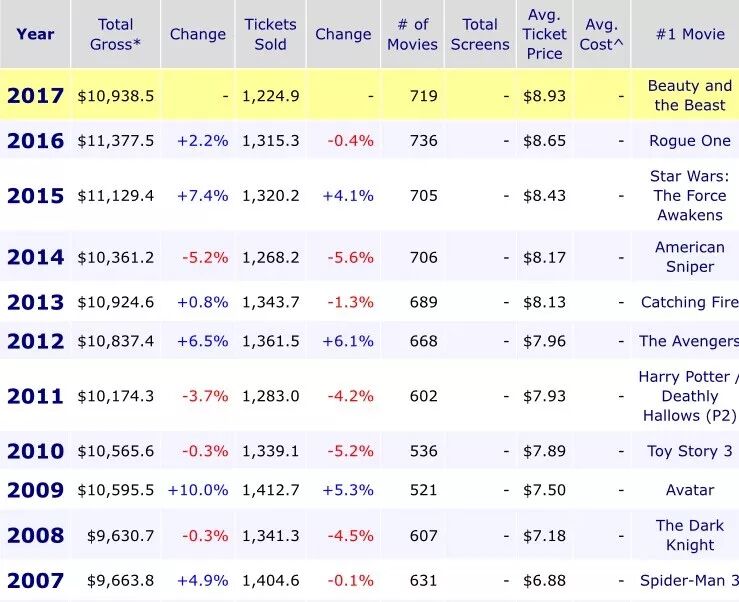 全球第一大市场北美,全年票房约109.4亿美元(折合人民币约712亿),跟去年的113.8亿美元相比,同比下跌3.86%。观影人次12.25亿,较去年的13.15亿下跌6.87%。因为北美市场的平均电影票价每年都在涨(2017年为8.93美元,折合人民币58元),所以表现在总票房上,跌幅相对没有观影人次那么大。