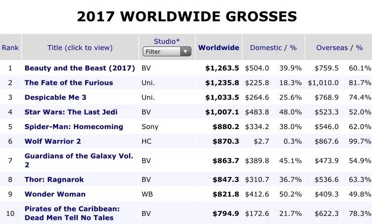 不过,好莱坞的电影,还有非常大的海外市场,加在一起,《美女与野兽》全球票房12.635亿美元,折合人民币约82亿,而《战狼2》作为华语片在其他海外市场的观众很少,跟本土比,海外票房少到几乎可以忽略不计。比如在北美,《战狼2》的票房只有272万美元。