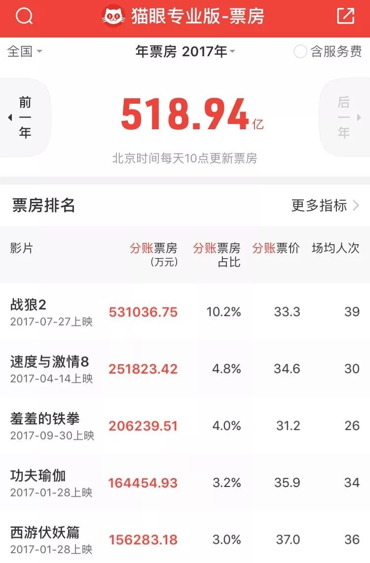需要说明的是,从2017年开始,电影综合总票房统计里首次计入了网络售票平台的服务费。如果除去“服务费”,全年净分账票房应是519亿(猫眼专业版数据,综合票房553亿,比电影局官方数据少6亿),较去年的454亿(比电影局官方数据457亿少3亿)增14.25%。
