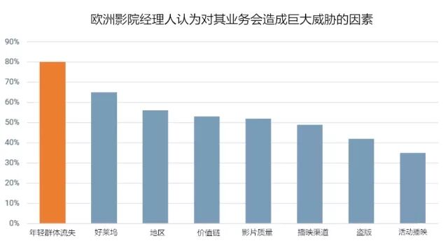 这种趋势令人担忧,对影院经理们来说更是如此,因为他们需要依靠那些容易取悦且爱消费的年轻群体。最近的一项研究发现,欧洲的影院经理人对年轻观影群体日渐流失的关注度,是关注盗版电影的两倍。以下是欧洲的影院经理人认为会对其业务造成威胁的因素排行统计。