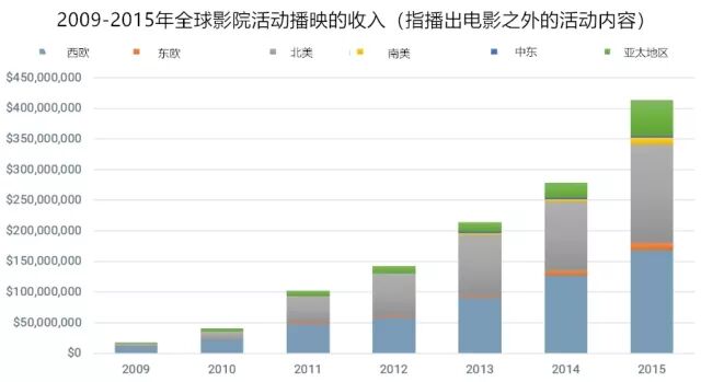 20世纪上半叶,电影放映场所发生了很大的变化。它们开始放映短小花哨的电影、增加现场音乐、增加新闻短片、两部影片同场放映等等。在20世纪后半叶,电影的放映流程基本成型,大众可以预想到所有电影院基本的放映内容,即广告、预告片和剧情长片。但最近,电影院开始更有创造性地去填充它们的放映内容。 我们看到一个日渐流行的现象在发生,包括众筹包场放映(类似ourScreen 组织的活动)、在电影院直播活动(如国家大剧院的现场直播)、沉浸式复合影院(如Secret Cinema)。以下是2009年至2015年全球影院活动播映(指播出电影之外的活动内容)收入的统计数据。