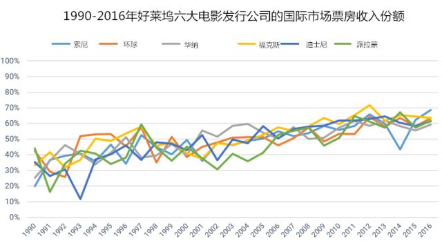 1997年,电影(特指在北美地区首映)的国际市场票房收入份额首次超过了国内市场,这主要是由于三部电影在全球带来的强劲表现:《泰坦尼克号》(70%)、《黑衣人》(57%)和《失落的世界》(63%)。 但直到2003年,国际市场的票房收入比重才真正占据了主导地位。以下是1990年至2016年好莱坞六大电影发行公司的国际市场票房收入份额的统计数据。