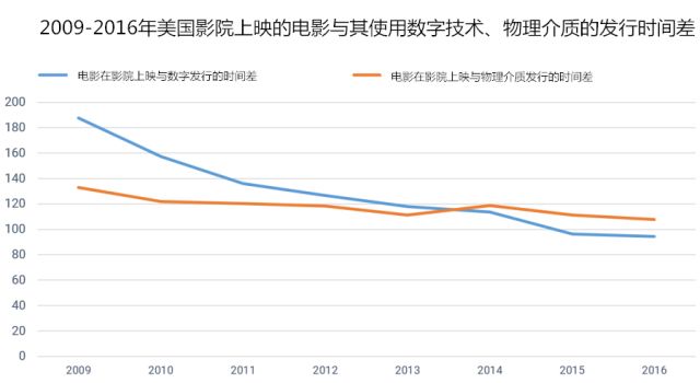 视频点播(VOD)仍是一个不断发展的市场,重要性也在日益增长。一直以来,“第三窗口”(即家庭娱乐)是电影的关键收入来源。如今,基本上数字电影发行之后才可以买或者租到光盘,因此现在VOD对于所有电影而言是个全新的“第三窗口”。以下是2009年至2016年美国电影在影院上映与其使用数字技术、物理介质的发行时间差的统计数据。