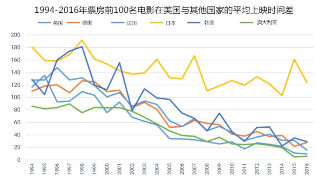 在20世纪90年代,美国发行的电影进入其他国家时上映时间出现了明显的延迟。在21世纪初,同一部电影在美国和英国的上映时间平均相差135天。而在接下来的16年里,这个数字下降了96%。并且,该趋势在大多数发达国家都得到了印证,这一现象的出现是由以下三种因素共同作用的:即好莱坞打击盗版的决心、分销技术的日益进步和社交媒体营销全球化的强大能力。以下是1994年至2016年票房前100名电影在美国与其他国家的平均上映时间差的统计数据。