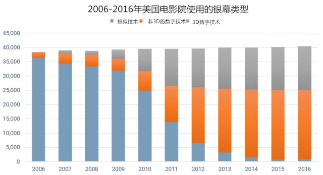 十年后,美国电影的放映几乎全部采用数字手段,仅有2.2%的电影坚持使用模拟投影。数字底片的生产和运输成本更加低廉,同时质量更好且不会变质而极易回收,可以更好地保护版权所有者的权益。以下是2006年至2016年美国电影院使用的银幕类型的统计数据。