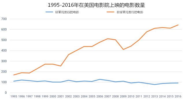 2016年,美国电影院上映的电影数量达736部,这个数字是2000年的两倍。我们把这些电影分成两个阵营,一个是来自发行范围极广的好莱坞六大电影公司(华纳、迪斯尼、福克斯、派拉蒙、索尼和环球),另一个是来源于所有其他公司的电影。数据表明,电影发行量的大幅增长并非来自于我们所熟知的好莱坞大片,事实上它们反而略有下降。在2006年,有128部采用广泛发行策略的大制片厂电影,到2016年仅剩下93部,10年间数量下降了27%。以下是1995年至2016年在美国影院上映的电影数量的统计数据。