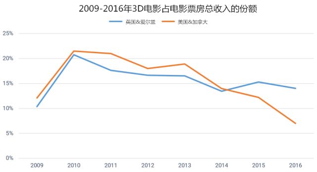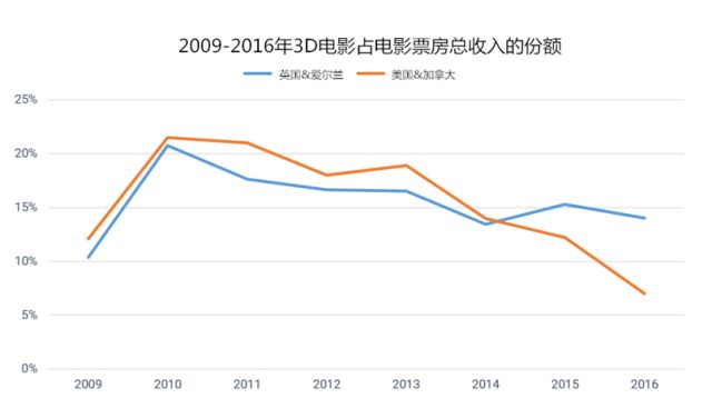 3D电影在80年代兴起,并于2010年左右开始进入繁荣期。但最近的数据表明,观众已经厌倦了3D电影,他们更倾向于选择2D电影。纵观3D电影所占年度票房总收入的百分比,我们发现2010年达到了它的最高点。之后,英国和北美的3D电影市场份额都出现了几乎一致的下滑。 2010年,3D电影的票房份额占美国年度总票房收入的22%。而到了2016年,这个数字下降到7%。同样地,3D电影在英国的市场份额从2010年的21%,下降到2016年的14%。以下是2009年至2016年3D电影占全年电影票房总收入份额的统计数据。