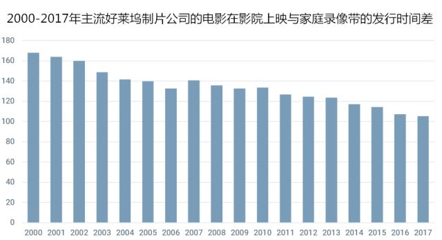 2000年,好莱坞电影在公映之后,再以家庭录像带(DVD、蓝光碟)的形式发行平均需要171天。在2017年,发行时间差缩短到105天,同比下降了39%。以下是2000年至2017年主流好莱坞制片公司的电影在影院上映与其使用录像带的发行时间差的统计数据。