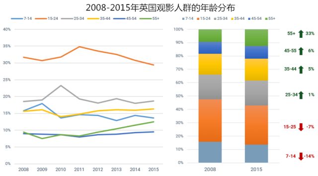 虽然年轻人正在失去走进电影院的兴趣,但是大龄群体的观影频率却在迅速提高。2008年至2015年之间,英国55岁以上的平均观影次数增长了三分之一。这背后的原因包括“婴儿潮”一代的老龄化、人口的日渐长寿、退休人员和“影生代”人群的活跃度提高。这样的变化为一些电影的票房做出了很大贡献,如《国王的演讲》和《涉外大酒店》,同时也提醒电影制作者,在饱和的电影市场中仍有一批需求未被满足的观众群体,那就是这群大龄观众。以下是2008年至2015年英国观影人群年龄分布的统计数据(左图)和2008年与2015年不同年龄观影群体占比的统计数据(右图)。