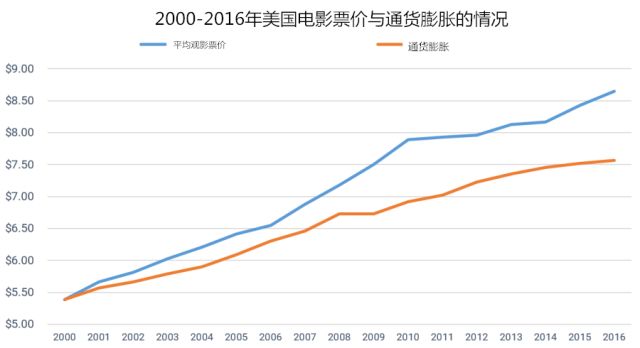 目前,电影票价的涨幅已经超过了通货膨胀。电影行业已经开发出越来越多有关提高票价的手段,包括3D、IMAX和大片电影的额外收费等,票价的上涨和电影院偷偷进行的调价行为成为观影人群最爱抱怨的话题。在研究中发现,英国非高峰时期标准2D电影票的平均价格是9.84英镑,高于行业官方所公布的平均价格6.72英镑,这是因为英国适用的行业计算方法为总票房收入除以销售量,但并未把免费和折扣电影票考虑在内。以下是2000年至2016年美国电影票价与通货膨胀变化对比的统计数据。