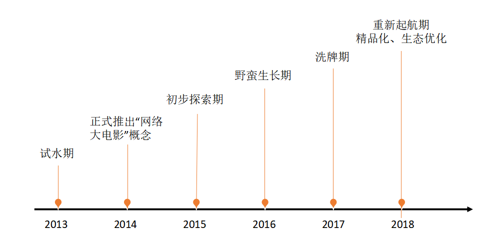 网络大电影的概念出现于 2014年,为了与之前网络流行的“微电影”区分,将影片时长较长、制作更为精细、投资更大的网络电影形式称为“网络大电影”。早期的网络电影投资较少,在内容上主要以猎奇、悬疑和轻科幻为主,制作较为简单,在影片宣传上也不够成熟,多借热门IP的热度。在这期间,网络电影也做了一些较为初步的探索,建立起了一套专业的审片流程、评级标准、票房分账及宣传资源分配政策等。