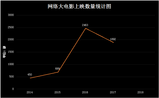 2016年,网络电影数量猛增,真正迎来了网络电影吸金的新时代。2016年上线的网络电影共有2500部左右,相较于之前的百部级别,是一次较大的飞跃。2016年网络电影数量裂变式的增长与较强的市场活力令人惊叹,但由于发展速度过快,监管尚未跟上其发展的步伐,因此导致网络电影市场发展不够成熟,出现很多不良的内容。2016年是网络电影的“野蛮生长期”,在野蛮生长期后,平台、市场与政府管理部门均意识到网络电影生态治理的必要性与紧迫性,而这也是2017年至今网络电影良性发展最重要的主题。