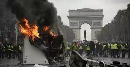 香榭丽舍大街上几十家奢饰品商店被抢了,各种古建筑也被毁了,连法国的象征凯旋门也身处一片火海。