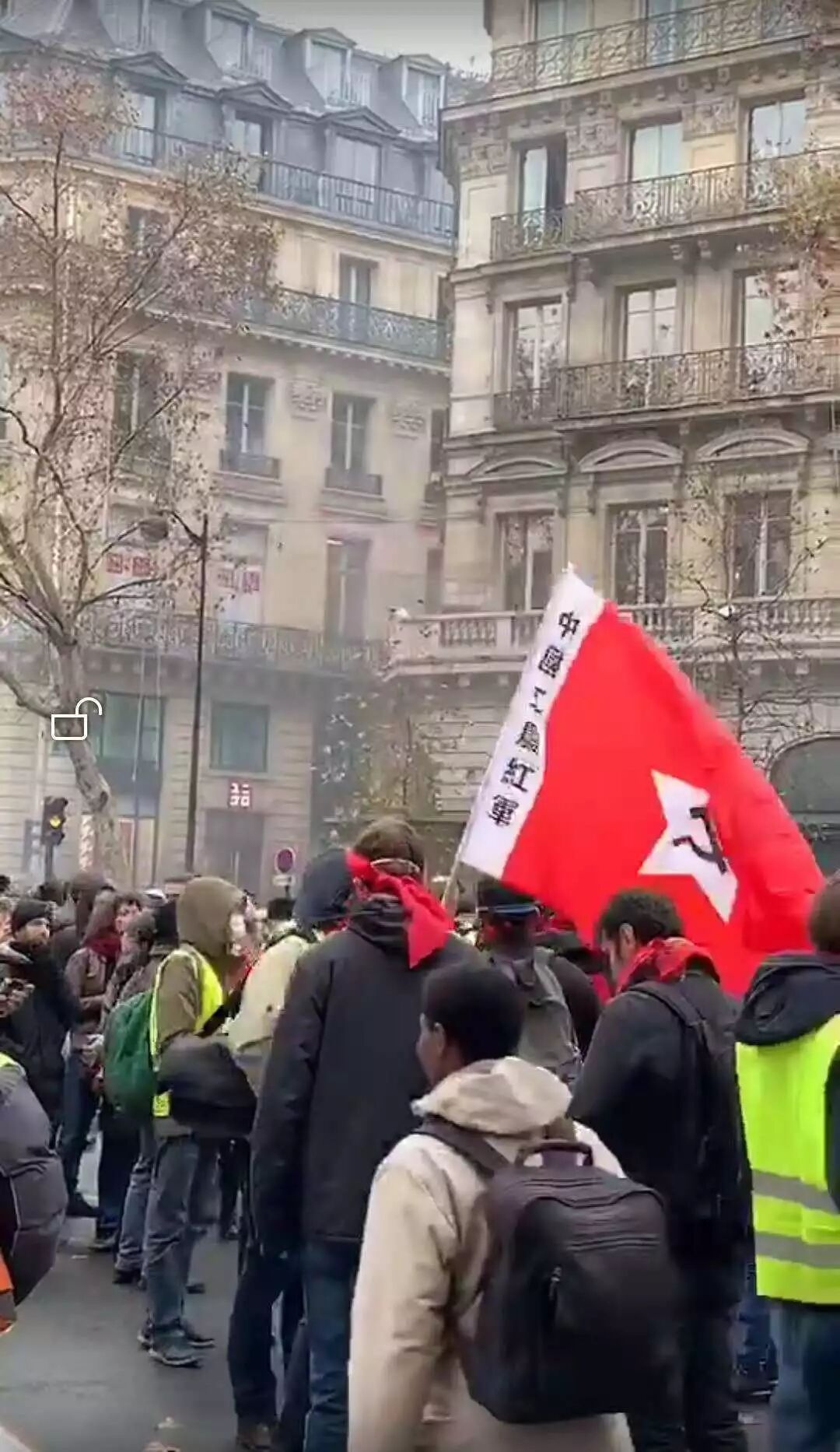 在这一次的黄马甲示威游行中,有个很有意思的地方是,有一伙人打起来了中国工农红军的旗帜,高喊着口号要推翻资产阶级。