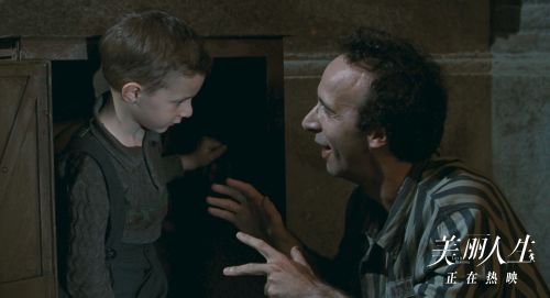 电影《美丽人生》的前半部分,展示了一个幽默诙谐、充满了勇气与美好的爱情故事。犹太青年圭多邂逅了他的公主多拉,他总是会以“早安,公主!”来问候她,想方设法让他的“公主”开心。时光一晃而过,两人有了一个可爱的儿子约书亚。可好景不长,当纳粹的黑暗势力逐渐弥漫,在约书亚5岁生日那天,父子两人被抓往集中营。为了保护孩子纯真的心灵,远离集中营的阴霾和血腥,父亲圭多选择将集中营的一切变成一场积分游戏,以下情况则会直接失分:哭闹、说要找妈妈、饿着肚子要吃点心,而谁先获得1000分,谁就能获得一辆真正的坦克。正是这个“世界上最美丽的谎言”为儿子约书亚创造了一个美丽人生,没有给他留下任何阴影。