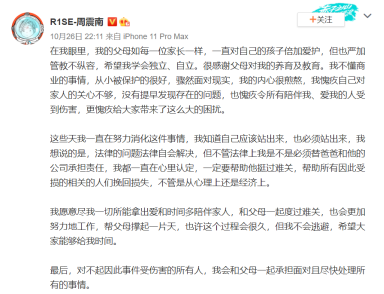 黄明昊的这件事又让网友想起了之前周震南父亲被曝“老赖”一事。今年10月25日,网曝周震南父母欠钱不还,早在2016年就被列入失信人名单。随后事件持续发酵,周震南父母被曝不仅拖欠银行欠款,还挪用几百户业主的维修基金费。