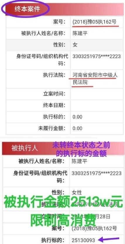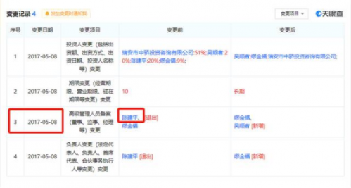 虽然在2017年5月8日该公司做了法人股东变更,陈建平退出公司,但陈建平4次上老赖名单,最早的一次是2016年,就算陈建平担保贷款是她退出欠款公司之后的事,也洗脱不了利益相关的嫌疑。