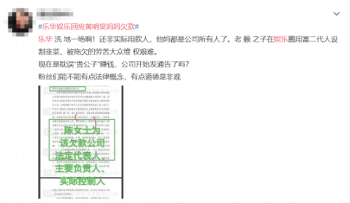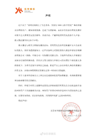 11月10日,黄明昊的经纪公司乐华娱乐公开发表声明回应黄明昊妈妈欠款一事,称黄明昊的妈妈一直在积极履行担保义务,并且会在事情得到妥善解决后第一时间向大家通报。
