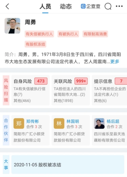 11月9日,周震南父亲被曝光被冻结权益总额9300万元,冻结日期至2023年11月4日。此外,据天眼查App数据显示,四川省简阳市大地生态发展有限公司曾多次被最高人民法院列为失信公司、限制高消费企业,而周震南父亲本人身上涉及的风险诉讼等风险信息逾2000条。