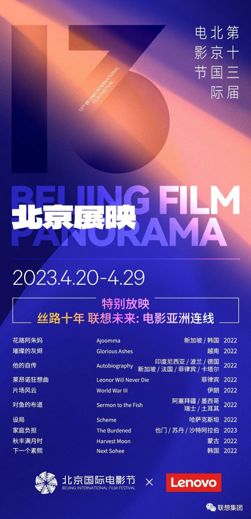 据此,第十三届北京国际电影节特别推出“丝路十年 联想未来:电影亚洲连线”展映单元,联想集团倾力支持,以官方指定科技合作伙伴身份助推丝路国家多元文化交流互鉴。这也是北京国际电影节继推出改革开放40周年、新中国成立70周年、建党百年、北京冬奥会等特别展映之后,为展现“一带一路”在亚洲和全球范围内的发展成果策划的又一特展单元。