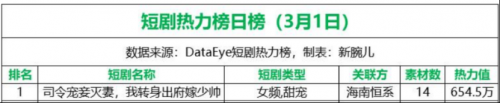 在3月2日,《司令宠妾》以605万热力值,继续位列第一。