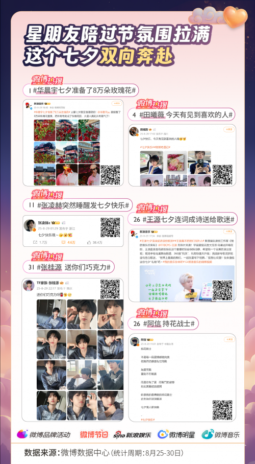 七夕之夜,还有熠熠星光。报告显示,明星粉丝的七夕互动方式不断升级。#华晨宇七夕准备了8万朵玫瑰花#话题阅读量大爆,“火星人”感叹“太有福气”;@田曦薇 分享的“今天有见到喜欢的人”温馨日常;@张凌赫 半夜发出“七夕快乐”惊醒粉丝;@TF家族-张桂源 与巧克力合影自拍十二宫格让粉丝大呼满足;此外,@阿信 的 “持花战士”文案将摇滚精神与浪漫情怀完美融合;#王源 七夕连词成诗送给歌迷#展现创作才华。明星粉丝双向奔赴,七夕不只是情人专属,也是全民表达爱意的契机。
