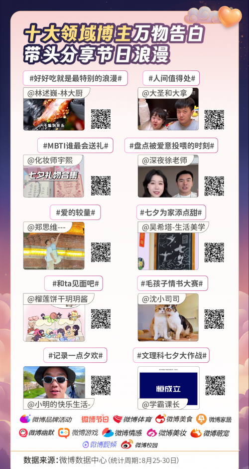 全民爱意,可以告白万物。在微博七夕氛围里,美食博主@林述巍-林大厨 用#好好吃就是最特别的浪漫#诠释舌尖上的爱意,@大圣和大拿 以#人间值得处#记录生活中的小确幸。@化妆师宇熙 通过#MBTI谁最会送礼#解码不同性格的浪漫密码,@深夜徐老师 用#盘点被爱意投喂的时刻#回答平凡日子里的感动瞬间。@郑思维--- 的#爱的较量#展现旅行路上的深情,@吴希塔-生活美学用#七夕为家添点甜#将浪漫元素融入居家生活。@榴莲饼干玥玥酱的#和ta见面吧#鼓励跨次元相聚,@沈小司司 的#毛孩子情书大赛#让宠物也成为告白主角。@小明的快乐生活- 的#记录一点夕欢#和@学霸课长 的#文理科七夕大作战#,也从不同维度记录七夕日常。跨界告白,让七夕化身全方位“爱的表达”。